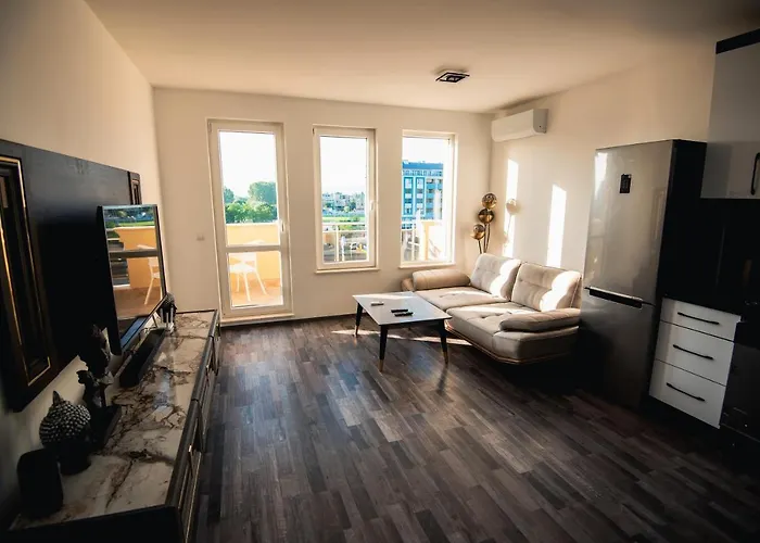 Modern Spacious 1Bd Apartment For Two In Nesebar cu 1 dormitoare este situată la 25 de minute de mers pe jos de Orașul vechi Nesebăr și la 4.7 km de Parcul acvatic Action. Oferind o terasă și vedere spre oraș, acest apartament de 84 m^2 este situat în cartierul Nesebar New Town al orașului.